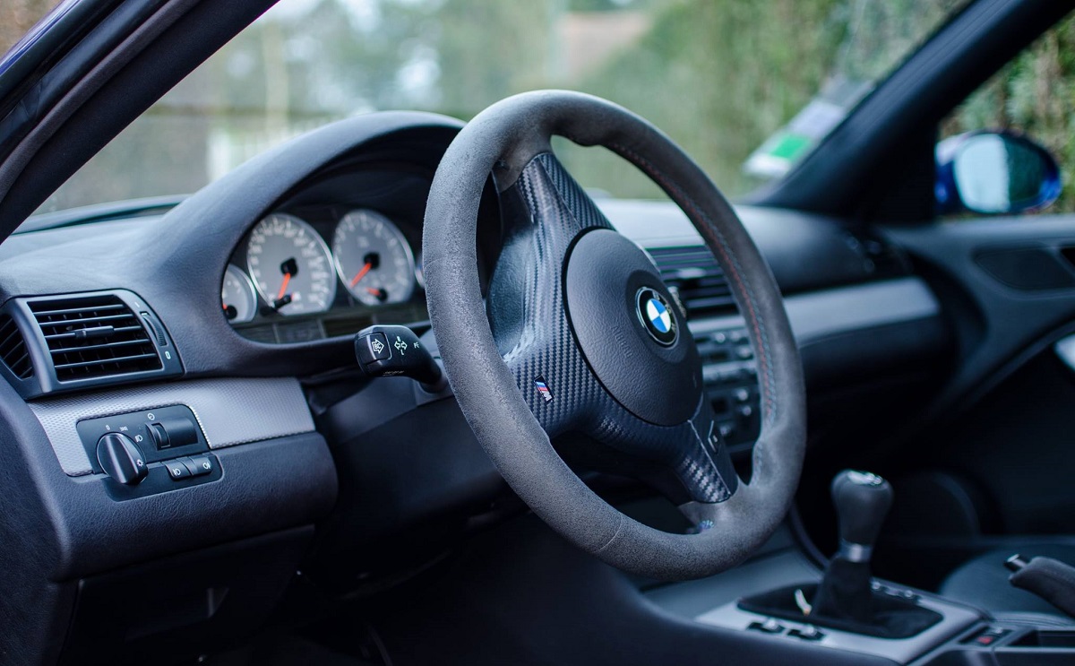 Mais elle a cette change d'avoir le pack compétition : jantes CSL 19'', volant alcantara CLS, disques de frein CSL, couleur bleue interlagos (uniquement disponible via cette option), bouton M Track sur le volant, inserts décoratifs "Alu Tec" en aluminum sur le tableau de bord et les contre-portes, direction plus directe : ratio de 14,5:1 au lieu de 15,4:1, suspensions ferme.