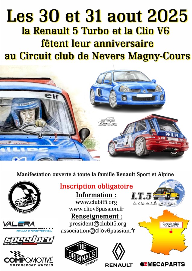 Les clubs Clio v6 Passion et IT5 organisent un grand évènement le week-end du 30 et 31 août 2025 pour fêter :